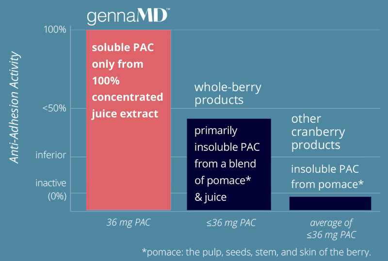 The quality of the PAC, which is directly related to the manufacturing process, matters. GennaMD is made by using an advanced double extraction process that ensures the PAC are taken only from cranberry juice extract.